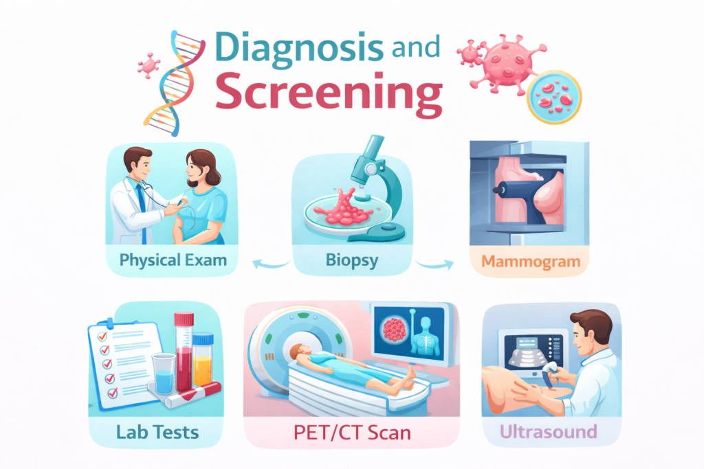 - Laboratory Tests: Blood or urine tests, such as complete blood counts for leukemia or tumor marker tests (e.g., CA-125 for ovarian cancer).